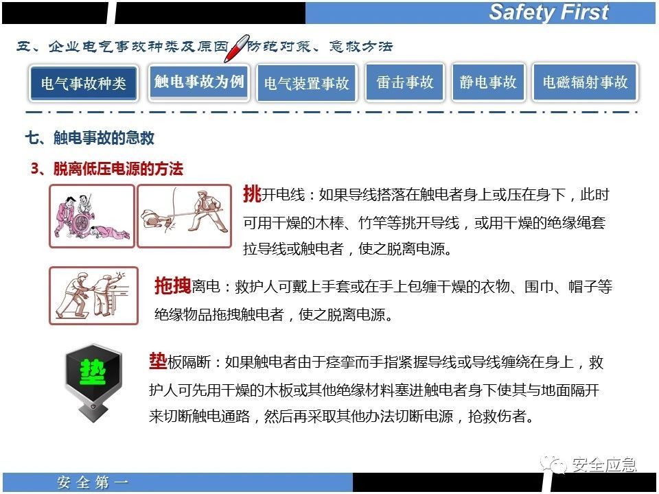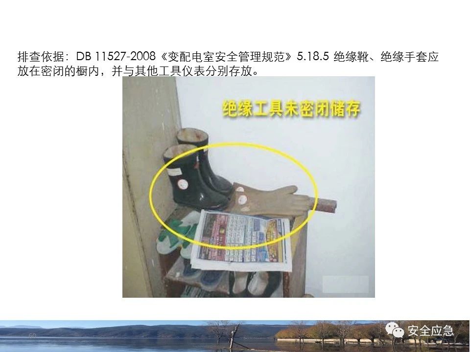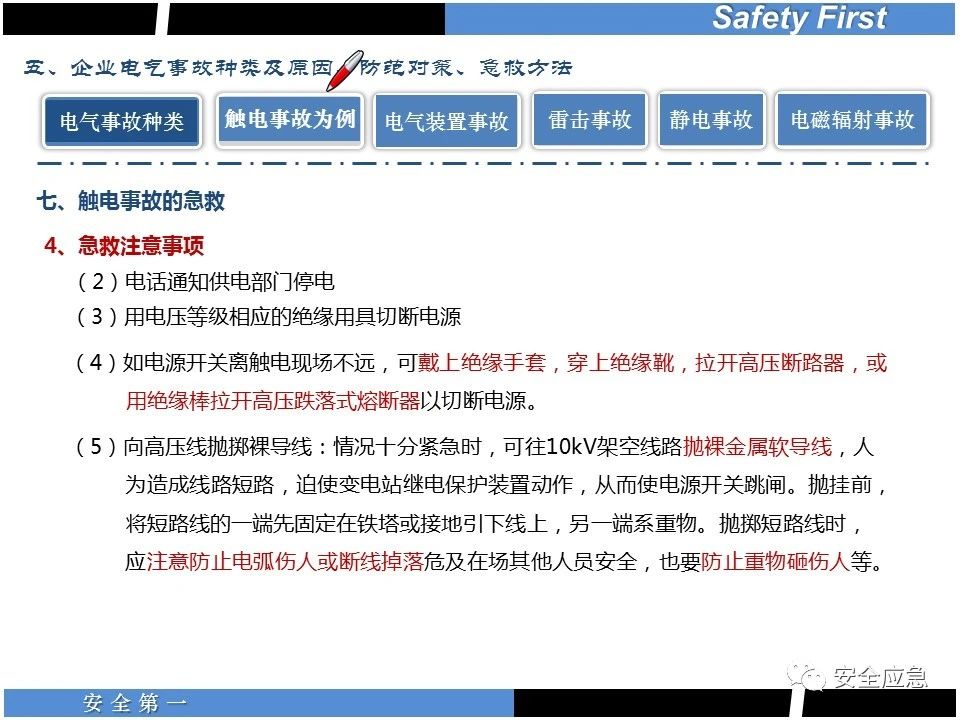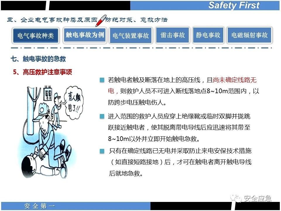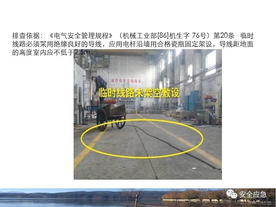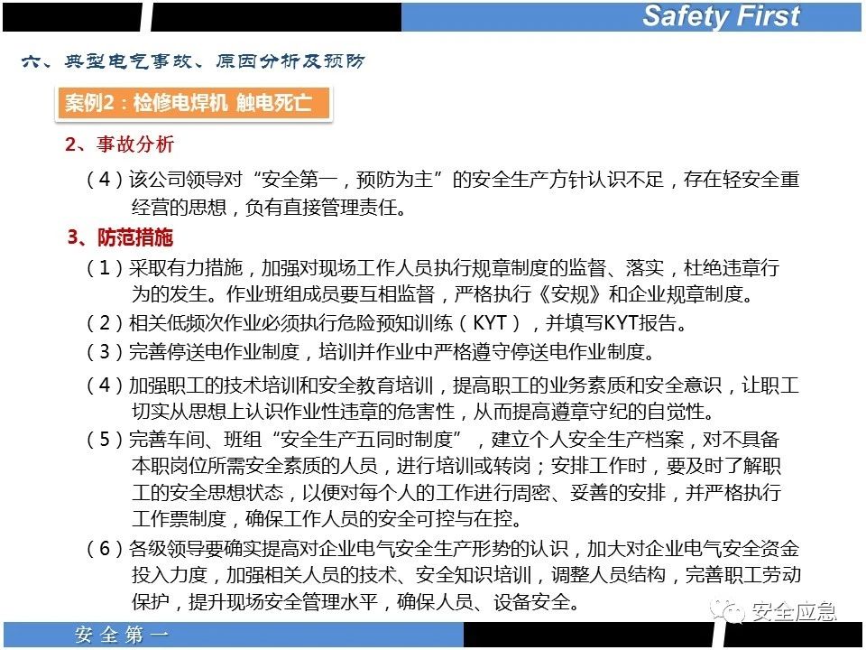 案例73 事故案例73:某35變電站準(zhǔn)備10kV避雷器試驗(yàn)。作業(yè)人員會(huì)同運(yùn)行人員準(zhǔn)備查看設(shè)備實(shí)際情況,拆卸10kV開關(guān)柜背板螺栓,打開了柜門上的電磁鎖,并打開了后柜門后,作業(yè)人員探頭進(jìn)入開關(guān)柜內(nèi)時(shí),對(duì)開關(guān)柜放電。 其它案例見17、18、19、20、21、22、23、50、52。 (27)多組人員組織混亂 案例74 事故案例74:某單位開展500kV線路停電檢修和地線融冰試驗(yàn)。1名工作人員不聽他人勸阻,登塔拆除引流線。隨后開展地線融冰試驗(yàn),該工作人員觸電死亡。 其它案例見45、46、47、48。 (28)交底不認(rèn)真 案例75 事故案例75:某工作負(fù)責(zé)人帶領(lǐng)兩名工作人員準(zhǔn)備在10kV線路裝設(shè)接地線。工作前,工作負(fù)責(zé)人沒有進(jìn)行班前(后)會(huì),沒有分配工作任務(wù),也沒有交代安全注意事項(xiàng),另外兩人也沒有主動(dòng)詢問,相互提醒,導(dǎo)致工作負(fù)責(zé)人無監(jiān)護(hù)誤登運(yùn)行線路,造成觸電。 其它案例見32。 (29)監(jiān)護(hù)不到位 l 單人工作無監(jiān)護(hù) 事故案例:36。 l 監(jiān)護(hù)人參與工作 事故案例:11。 l 監(jiān)護(hù)不認(rèn)真,或默許違章行為 事故案例:67。 (30)人員、工作安排不恰當(dāng) 案例76 事故案例76:某供電所安排不具備單獨(dú)工作資格和能力的新入廠員工上桿進(jìn)行配變?cè)O(shè)備搶修工作,由于安全距離不夠,員工經(jīng)驗(yàn)不足,監(jiān)護(hù)不到位,導(dǎo)致觸電。 案例77 事故案例77:某高壓試驗(yàn)班開展定檢預(yù)試作業(yè)。工作負(fù)責(zé)人與工作人員在抄錄放電計(jì)數(shù)器銘牌,另一名剛參加工作不久的工作人員拿著自制試驗(yàn)線插入移動(dòng)電源盤插座內(nèi),然后,用左、右手分別拿住兩個(gè)鱷魚夾準(zhǔn)備對(duì)放電器搭接做試驗(yàn),左、右手習(xí)慣性的分別握住了兩個(gè)鱷魚夾的導(dǎo)體部分,此時(shí)電流通過人體,漏電保護(hù)器沒有動(dòng)作,觸電死亡。 (31)單人作業(yè) l 野外單人巡線、勘察 案例78 事故案例78:某單位開展線路巡視時(shí),單人作業(yè),在被告知“巡視完N58塔后切勿過江,要沿原路返回”的情況下,仍然獨(dú)自一人違規(guī)游泳過江,溺水身亡。 案例79 事故案例79:某單位野外勘察時(shí),某工作人員在未告知工作負(fù)責(zé)人的情況下,獨(dú)自一人返回車輛所在地,途中墜落懸崖暈倒,受輕傷并失蹤12小時(shí)。 附件:最全面的電氣安全培訓(xùn),實(shí)用!