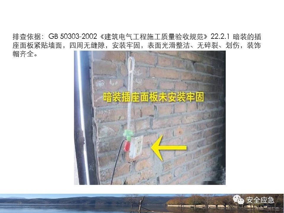 案例57 事故案例57:某工作人員在作業(yè)平臺(tái)工作,由于作業(yè)平臺(tái)不牢靠,安全帶掛系不牢靠,移動(dòng)過程中踩到未綁扎的腳手板,失穩(wěn)導(dǎo)致高處墜落。 案例58 事故案例58:某供電所處理用戶低壓架空導(dǎo)線斷落故障。準(zhǔn)備在斷線處的房子墻角加裝一組線碼和對(duì)02桿上四相導(dǎo)線進(jìn)行重新駁接,完成新線碼安裝及地面B相導(dǎo)線接駁。作業(yè)人員在地面系好安全帶,使用腳扣登桿進(jìn)行導(dǎo)線緊固及接電作業(yè),上桿后安全帶未固定就開始作業(yè)。在進(jìn)行B相導(dǎo)線接電時(shí)不慎從桿上滑下墜落死亡。 案例59 事故案例59:某供電所員工在現(xiàn)場作業(yè),沒有采取防墜落安全措施,沒戴安全帽,爬上梯子,站在離地面約4米高處,右手解開綁扎線。扎線松脫時(shí),手部失去受力點(diǎn)后,失去平衡,向后翻倒墜落,經(jīng)搶救無效死亡。 案例60 事故案例60:某施工隊(duì)開展10kV線路桿塔旁的樹木修剪工作。一名工作人員在未正確佩戴安全帽的情況下,修剪樹木下移時(shí),不慎踩斷枯枝從約3.5m高的樹上墜落,墜落過程中安全帽脫離,頭部直接著地死亡。 l 使用非絕緣工器具 案例61 事故案例61:某變電站核對(duì)設(shè)備銘牌,設(shè)備銘牌在設(shè)備頂部帶電位置(距離地面3米左右)。工作人員使用抄表器遠(yuǎn)距離隔空觀看,由于距離較遠(yuǎn),于是使用抄表器頂在左腹部,將抄表器繼續(xù)緩慢向上調(diào)整試圖觀看清楚。調(diào)整過程中,造成避雷器帶電側(cè)對(duì)抄表器上端頭放電,造成觸電。 l 不使用絕緣工器具或絕緣性能不合格 案例62 事故案例62:在某10kV線路搶修過程中,對(duì)線路進(jìn)行分段試送時(shí),操作人員帶故障合上隔離開關(guān)對(duì)線路送電,產(chǎn)生弧光。加之由于在雨天用無防雨罩的絕緣棒,操作人員沒有穿絕緣靴,操作人員觸電死亡。 案例63 事故案例63:某工作人員單人在下雨的情況下未使用任何工具拆除0.4kV臨時(shí)用電線路,導(dǎo)致觸電。 其它案例見22、50。 l 不使用工器具或施工機(jī)具 案例64 事故案例64:某施工現(xiàn)場一電動(dòng)切割機(jī)外殼沒有有效接地,漏電開關(guān)不合格,使用前未檢查。施工人員走近切割機(jī),沒穿絕緣鞋,外殼放電,人員觸電死亡。 其它案例見13、14、15、62。 (24)設(shè)備、工器具存在隱患 l 設(shè)備存在缺陷 案例65 事故案例65:某抽水蓄能電站開展引水斜井施工。施工人員進(jìn)入現(xiàn)場施工,其中1人操作卷揚(yáng)機(jī),1名班長和1名安全員在斜井上方的平臺(tái)上組織施工和監(jiān)護(hù),其余7名施工人員進(jìn)入斜井開展軌道拆除工作。送料小車2名運(yùn)行人員操作送料小車上井,送料小車向上運(yùn)行至距上井口50米左右時(shí),因卷揚(yáng)機(jī)故障且制動(dòng)失效,小車突然由上行轉(zhuǎn)為下滑,1名小車運(yùn)行人員隨即從小車側(cè)面跳出,另外1名小車運(yùn)行人員未能跳出,隨同小車一起墜落。小車在墜落過程中,撞上下方正在拆除軌道的5名施工人員,并將其中3人直接撞落至井底,另2人被撞至軌道下方的井壁上。最后造成6人死亡。 案例66 事故案例66:某施工隊(duì)開展10kV線路桿號(hào)噴刷工作。工作班成員用左手去拉開垂吊在電桿上的拉線時(shí)觸電。檢查發(fā)現(xiàn)桿兩條拉線中的一條拉線釬鋼從地端脫出,拉線松弛懸掛在電桿上,作業(yè)人員拽碰該拉線時(shí)導(dǎo)致拉線與帶電的B相引流線搭碰放電。 案例67 事故案例67:某供電所開展10kV故障線路分段試送工作。工作人員穿絕緣靴、佩戴絕緣手套使用絕緣操作桿,對(duì)#12桿分段開關(guān)進(jìn)行合閘操作時(shí),開關(guān)負(fù)荷側(cè)B相引線在支撐瓷柱處發(fā)生電弧火花燃燒(后發(fā)現(xiàn)B相引線燒斷),工作人員觸電倒地,由于跨步電壓觸電死亡。經(jīng)檢查,發(fā)現(xiàn)#12桿分段開關(guān)安裝質(zhì)量存在嚴(yán)重缺陷、工藝不滿足安全規(guī)程要求,負(fù)荷側(cè)B相引線與鄰相距離不足,且違規(guī)將B相引線固定在支撐絕緣子第一片傘群處,導(dǎo)致B相導(dǎo)線磨損后發(fā)生間歇性發(fā)電。 案例68 事故案例68:某變電站抄錄35kV某線路避雷器放電記錄器動(dòng)作數(shù)據(jù)。該避雷器放電記錄器離地面高度4.7米,值班運(yùn)行人員無法用肉眼直接看清數(shù)據(jù),長期存在值班人員使用低壓電能表抄表器抄錄放電記錄數(shù)據(jù)的重大安全隱患。工作人員使用非絕緣工具進(jìn)行抄錄,監(jiān)護(hù)人員未提出異議,導(dǎo)致觸電。 其它案例見60。 l 工器具存在缺陷 案例69 事故案例69:某單位進(jìn)行線路施工工作。工作人員在使用有毛刺的大錘敲擊鐵釬時(shí),毛刺脫落飛出,飛到距離3.8米遠(yuǎn)處工作人員身上,擊中頸動(dòng)脈,醫(yī)治無效死亡。 (25)風(fēng)險(xiǎn)管控不到位 案例70 事故案例70:某施工隊(duì)將貨車上的700米左右導(dǎo)線的導(dǎo)線盤放到地下。當(dāng)兩人同時(shí)打開車廂后擋板們時(shí),貨廂內(nèi)的導(dǎo)線盤突然從車上滾下,把一名員工整個(gè)人壓在下面,經(jīng)搶救無效后死亡。 案例71 事故案例71:某施工隊(duì)新建110kV變電站時(shí)開展10kV#2電容器組電抗器就位工作。當(dāng)電抗器移動(dòng)至兩對(duì)槽鋼導(dǎo)軌的搭接口時(shí),前面槽鋼突然發(fā)生偏移,導(dǎo)