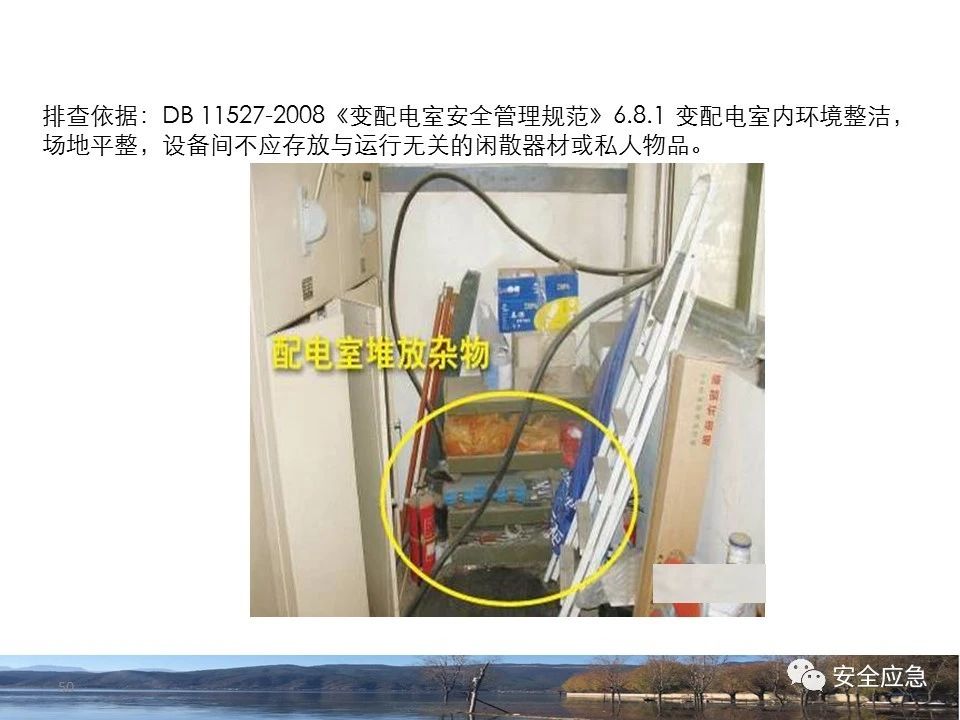 8.1.6規(guī)定配電箱、開關(guān)箱周圍應(yīng)有足夠2人同時(shí)工作的空間和通道,不得堆放任何妨礙操作、維修的物品,不得有灌木、雜草。