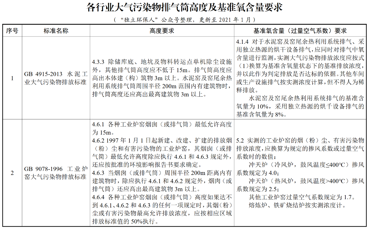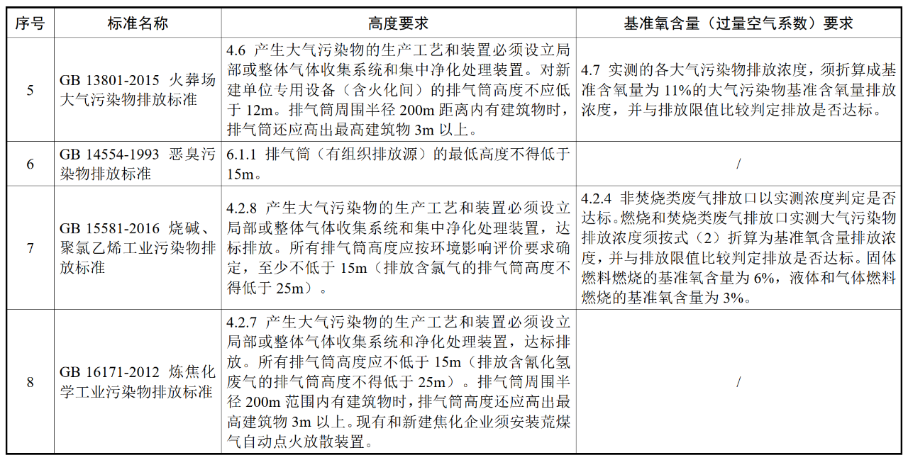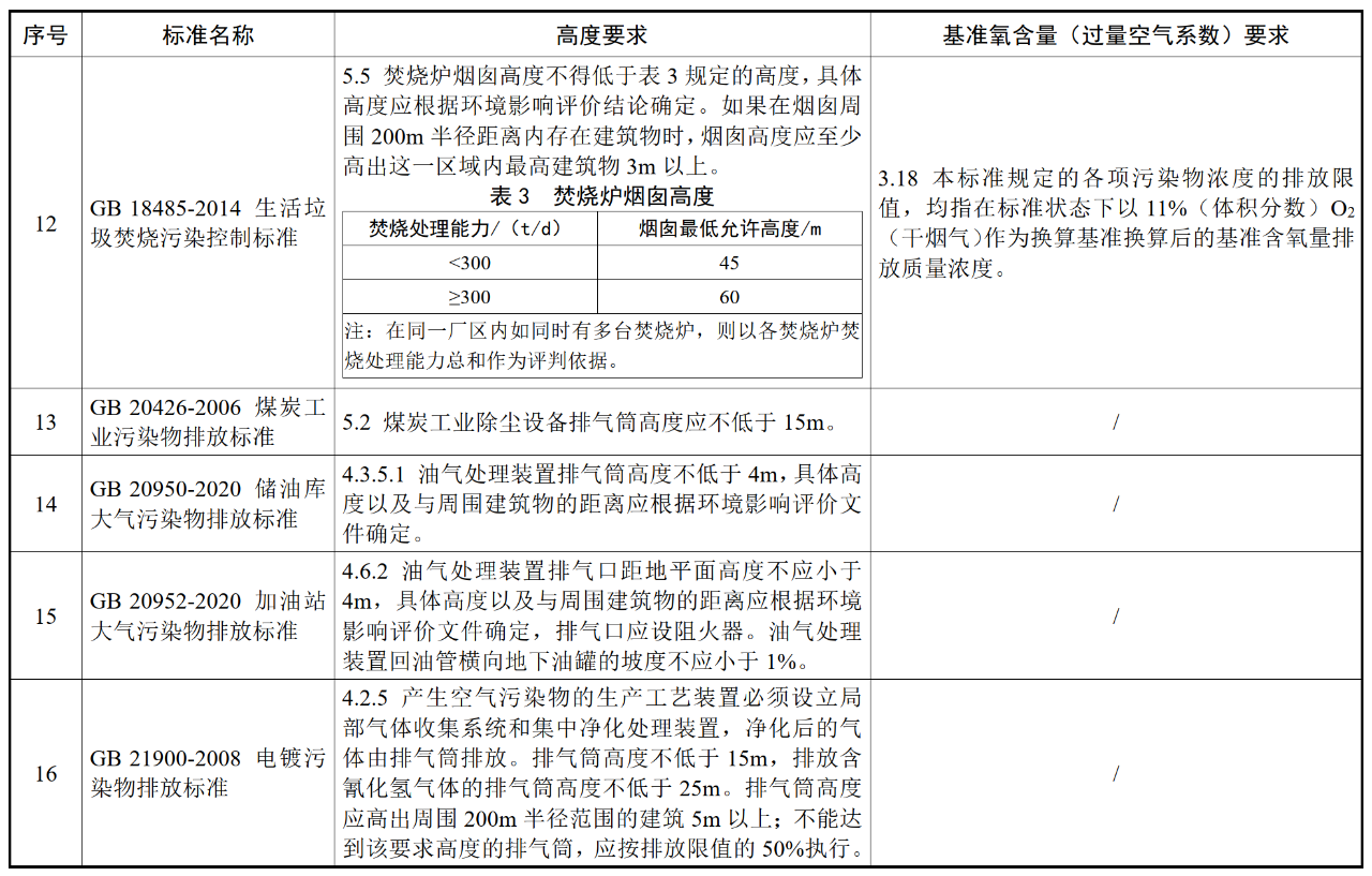 各行業(yè)大氣污染物(含VOCs)排氣筒高度及基準(zhǔn)氧含量要求
