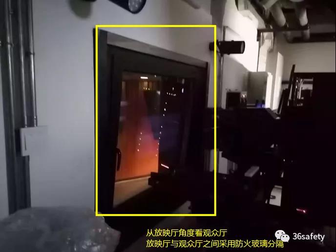 以下展示的2張照片,是在另外一個(gè)電影院(某皇電影城)夾層的放映廳拍攝的照片,這個(gè)電影院的放映廳和觀眾廳之間采用防火玻璃分隔。