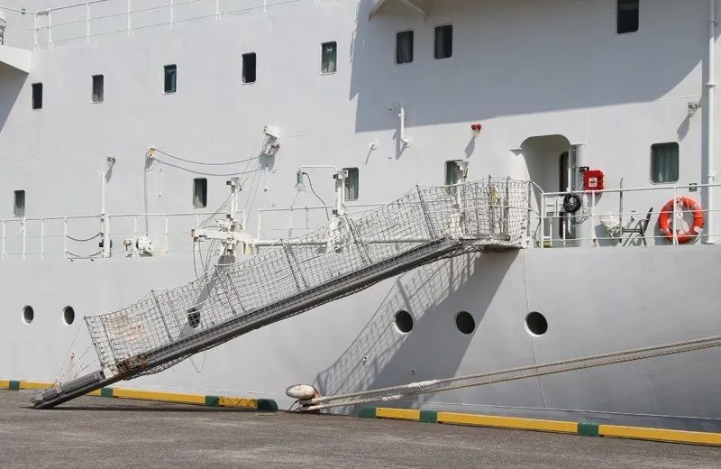 根據(jù)新生效的GB/T11701-2021《船用舷梯的基本規(guī)定》(3月1日起施行),舷梯主要分為兩類: (1)旋轉(zhuǎn)平臺式舷梯 單節(jié)舷梯、多節(jié)舷梯或伸縮舷梯的結(jié)構(gòu)與上面的旋轉(zhuǎn)平臺鉸接,可在船與登梯底面之間改變方向和傾斜角度。舷梯可用鋼絲繩或鏈從較低的(各)懸掛點掛住,或用固定在舷梯底部滾柱支持。 (2)固定平臺式舷梯 單節(jié)舷梯、多節(jié)舷梯或伸縮舷梯的結(jié)構(gòu)與上面的固定平臺鉸接,可在船和登梯底面之間改變傾斜角度。舷梯用鋼絲繩或鏈從較低的(各)懸掛點掛住,單獨使用的引航員舷梯采用此固定平臺式舷梯。 根據(jù)SOLAS第II-1章第3-9條款,凡是2010年1月1日及以后建造的船舶,必須在船上安裝經(jīng)認可的登/離船設施,以備在港口或港口相關操作時使用。 該登/離船設施必須根據(jù)MSC.1/Circ.1331通函的要求進行建造、測試、安裝及維護,主要包括以下八點要求: (1)登/離船設施應遠離工作區(qū)域以及貨物或其它物體懸掛吊裝時可能通過上方的區(qū)域,該登/離船設施的目的和使用方式與引水員登 / 離船裝置是不同的; (2)應提供足夠的照明,以照亮登/離船設施、甲板上人員登/離船和裝置控制的位置; (3)當?shù)?離船裝置在使用時,在其附近應備有一只帶有自亮浮燈和救生浮索的救生圈(注意這里是要求一只救生圈既配備有自亮浮燈又配備有救生浮索,并且處于隨時可用狀態(tài)); (4)每部舷梯應具有在其最大操作傾斜角時,下平臺在最輕載水線以上不大于600mm的高度; (5)在每部舷梯或跳板梯的兩端應設置一塊標記牌,以清楚顯示安全操作和負荷限制,包括最大和最小允許設計傾斜角、設計負荷、最大底端板負荷等,如果最大操作負荷小于設計負荷,則最大操作負荷也應顯示在標記牌上; (6)跳板梯使用時安放水平傾斜角不應大于30度和舷梯使用時水平傾斜角不應大于55度; (7)在人員從登/離船設施或船舶與碼頭之間可能墜落的舷梯下應安放安全網(wǎng); (8)正確設置舷梯下平臺的安全插銷。 收放前:應對升降機械、鋼絲繩、滑車轉(zhuǎn)盤平臺支架等進行檢查,確認設備完好,鋼絲、卷筒、吊梁無障礙后方可作業(yè)。 收放過程中: (1)船靠離碼頭收放舷梯過程中,應有專人指揮,作業(yè)人員默契配合。在浮動的梯子上進行收起、安裝欄桿、護繩作業(yè)時,應先檢查平臺支架是否已可靠支好,并使用止蕩索,上舷梯操作人員必須系好安全帶,穿好救生衣。 (2)舷梯落岸下踏板應避開障礙物,安放平穩(wěn),嚴禁扭曲。吊梁、鏈條要注意絞高或安放妥當,以免碰頭和妨礙上下船。 (3)由于潮夕、裝卸貨、碼頭環(huán)境等因素影響,舷梯不能放置碼頭時,要注意隨時調(diào)整舷梯高度。當舷梯下踏板離碼頭較高較遠時,不允許勉強上下。梯口值班人員負責調(diào)整舷梯和提醒上下人員注意安全,必要時應按規(guī)定加裝橋梯。 (4)由于漲落潮、移泊等原因需要松緊纜繩時,應絞起舷梯,收起橋梯,或?qū)H丝春锰菘诮谷藛T上下。在無法使用舷梯時,要正確地搭設橋梯,必須綁扎牢固、裝妥扶手、掛好安全網(wǎng)后人員方可上下。禁止從船舷直接跳上碼頭,或從碼頭直接跳上船。 (5)舷梯、橋梯必須按規(guī)定張掛安全網(wǎng)。舷梯、橋梯處應有防墜落、防滑等安全指示標志。舷梯、橋梯的扶手、扶繩、階梯必須保持清爽、干凈、牢固,便于上下人員抓牢、踏實。 (6)禁止用舷梯吊運物品,禁止超載。