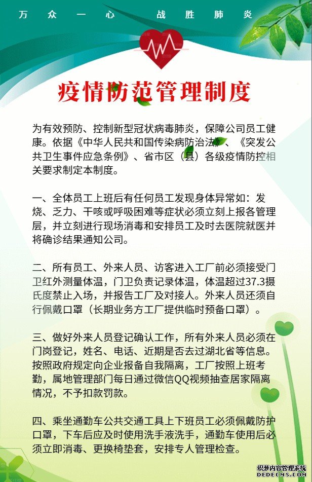 當前,新型冠狀病毒感染的肺炎疫情嚴重威脅人民群眾身體健康和生命安全,特別是節(jié)后工業(yè)企業(yè)陸續(xù)復(fù)工復(fù)產(chǎn),容易形成人員集聚,疫情防控形勢緊迫,責任重大。企業(yè)必須做好節(jié)后復(fù)工復(fù)產(chǎn)疫情防控工作。