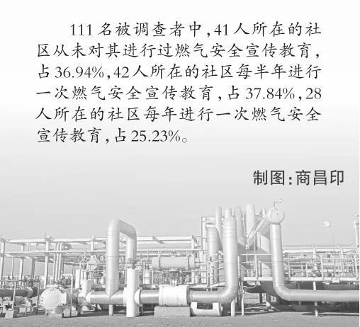 這一點(diǎn),從記者的問卷調(diào)查結(jié)果中也得到了印證。111名被調(diào)查者中,41人所在的社區(qū)從未進(jìn)行過燃?xì)獍踩麄鹘逃?,?6.94%,42人所在的社區(qū)每半年進(jìn)行一次燃?xì)獍踩麄鹘逃?,?7.84%,28人所在的社區(qū)每年進(jìn)行一次燃?xì)獍踩麄鹘逃?5.23%。