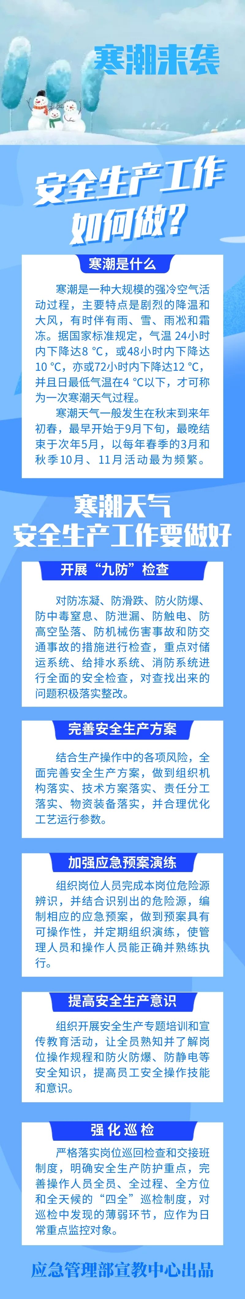 寒潮是一種大規(guī)模的強冷空氣活動過程,主要特點是劇烈的降溫和大風,有時伴有雨、雪和霜凍等,且因低溫雨雪冰凍災害鏈復雜,極易導致次生、衍生災害。寒潮來襲,如何確保生產(chǎn)安全?這份指南請收好。