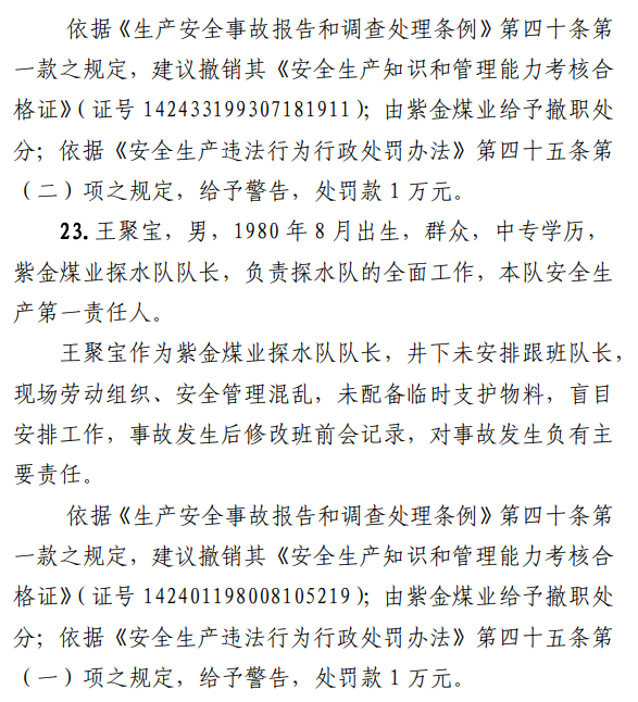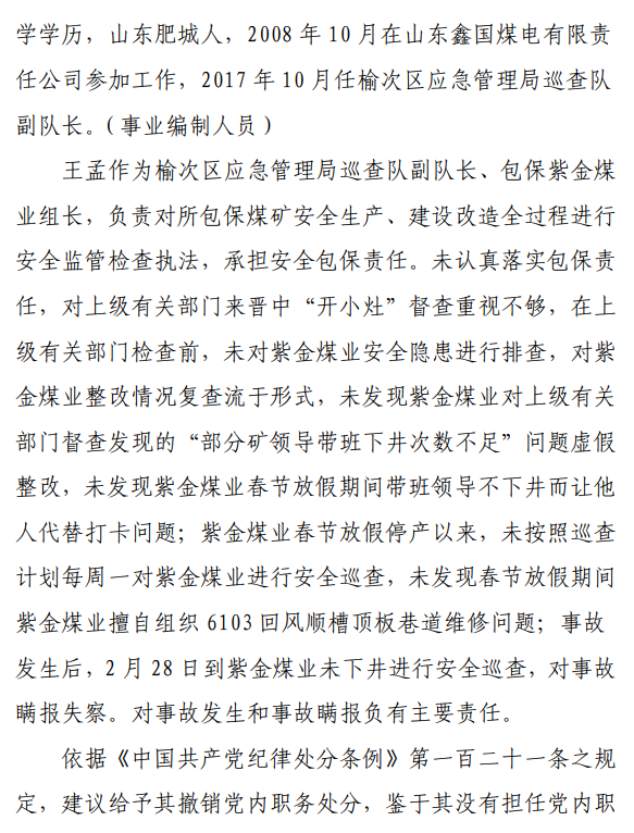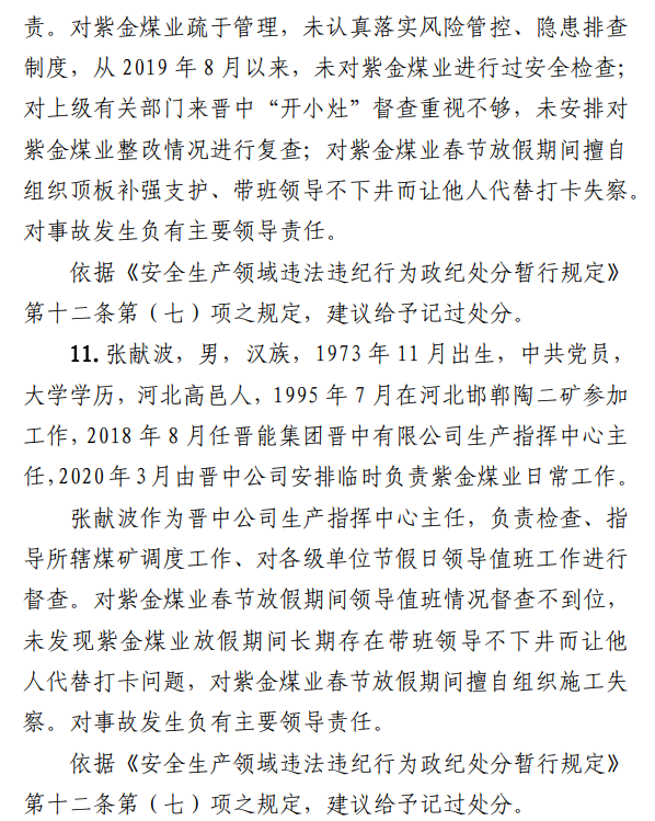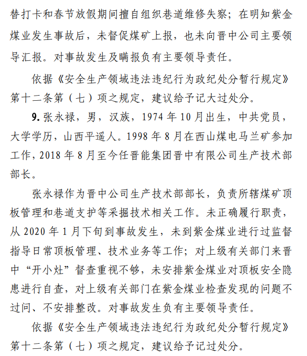 2月23日20時(shí)44分,探水隊(duì)副隊(duì)長(zhǎng)王志平通過(guò)6103回風(fēng)順槽距開(kāi)口950m處的電話,向礦調(diào)度室匯報(bào)了事故情況。20時(shí)46分,調(diào)度值班人員張宏強(qiáng)向礦長(zhǎng)郭英杰匯報(bào)事故情況。郭英杰立即啟動(dòng)應(yīng)急救援預(yù)案,組織煤礦相關(guān)人員開(kāi)展搶險(xiǎn)救援工作。救援人員使用單體液壓支柱、半圓木、鉸接梁對(duì)事故地點(diǎn)外圍巷道進(jìn)行臨時(shí)支護(hù),然后由外到里清渣、支護(hù),實(shí)施救援。被冒落頂板埋壓的劉永生、馬練水和王秀國(guó)于2月24日14時(shí)30分、2月25日6時(shí)30分、2月25日14時(shí)分別被救出升井。經(jīng)醫(yī)生在井口確認(rèn),3人已無(wú)生命體征,之后被送往榆次區(qū)殯儀館,搶險(xiǎn)救援工作結(jié)束。事故瞞報(bào)、謊報(bào)經(jīng)過(guò)2月24日,礦長(zhǎng)郭英杰安排信息中心主任梁煥修改人員定位系統(tǒng),關(guān)閉了工業(yè)視頻,刪除調(diào)度錄音通訊、虹膜數(shù)據(jù)。2月25日17時(shí)許,紫金煤業(yè)紀(jì)檢書(shū)記、黨總支副書(shū)記高建忠(臨時(shí)主持紫金煤業(yè)董事會(huì)及黨務(wù)日常事務(wù))和礦長(zhǎng)郭英杰組織召開(kāi)煤礦管理層會(huì)議。會(huì)上郭英杰、高建忠、紫金煤業(yè)安全生產(chǎn)技術(shù)總監(jiān)南海為了瞞報(bào)事故,對(duì)偽造出入井?dāng)?shù)據(jù)、修改人員定位數(shù)據(jù)、銷(xiāo)毀調(diào)度電話錄音、刪除視頻監(jiān)控資料、清理井下事故現(xiàn)場(chǎng)等事項(xiàng)進(jìn)行了安排。2月24日至25日,高建忠安排生產(chǎn)副礦長(zhǎng)杜永忠、安全副礦長(zhǎng)楊雙喜等人與遇難者家屬協(xié)商辦理賠償事宜,并安排遇難者家屬配合礦方瞞報(bào)事故。3月5日,在榆次區(qū)人民政府組織的核查過(guò)程中,郭英杰、高建忠均否認(rèn)事故發(fā)生,郭英杰、高建忠、南海繼續(xù)安排煤礦有關(guān)工作人員瞞報(bào)事故。3月8日上午9時(shí)許,在榆次區(qū)人民政府已查實(shí)事故、正在擬文上報(bào)的期間,紫金煤業(yè)向山西煤銷(xiāo)晉中公司、榆次區(qū)應(yīng)急管理局和晉中煤監(jiān)分局電話匯報(bào)事故,稱(chēng)三名巡檢人員走到事故地點(diǎn)時(shí),頂板突然冒落導(dǎo)致事故發(fā)生,謊報(bào)了事故的經(jīng)過(guò)和原因。2月23日22時(shí)左右,武全珍在井下安排王家偉完善措施內(nèi)容。王家偉出井后在措施中增加了:“頂板較完整區(qū)域補(bǔ)強(qiáng)支護(hù)期間采用單體支柱+鉸接頂梁做臨時(shí)支護(hù),頂板不平整處使用方木墊平、木楔背緊背實(shí)”,和“臨時(shí)支護(hù)安全技術(shù)措施”相關(guān)內(nèi)容。2月24日上午,武全珍安排王家偉在該措施中增加了“絞車(chē)運(yùn)輸安全技術(shù)措施”和“移動(dòng)乳化液泵使用安全技術(shù)措施”等內(nèi)容。3月8日,生產(chǎn)礦長(zhǎng)杜永忠安排探水隊(duì)隊(duì)長(zhǎng)王聚寶在班前會(huì)記錄中加上“先抽400米水”。當(dāng)天晚上,安全礦長(zhǎng)楊雙喜在在班前會(huì)記錄中加上“不準(zhǔn)進(jìn)尺,打好臨時(shí)支護(hù)再作業(yè)”等內(nèi)容。現(xiàn)場(chǎng)人員在無(wú)臨時(shí)支護(hù)的情況下違章進(jìn)行補(bǔ)強(qiáng)支護(hù)作業(yè),施工過(guò)程中頂板失穩(wěn)冒落,導(dǎo)致事故發(fā)生。1.紫金煤業(yè)對(duì)處于極限平衡狀態(tài)的6103回風(fēng)順槽頂板存在的安全隱患辨識(shí)不清、安全風(fēng)險(xiǎn)管控不力6103回風(fēng)順槽巷道埋深大、圍巖較軟,且為迎采對(duì)掘巷道,受臨近的6101工作面開(kāi)采動(dòng)壓影響大,多根錨桿錨索斷裂失效,巷道變形,底板鼓起,事故地點(diǎn)附近巷道頂板已處于高應(yīng)力的極限平衡狀態(tài)。事故發(fā)生前,事故地點(diǎn)附近巷道頂板已先后發(fā)生兩次冒落。紫金煤業(yè)對(duì)6103回風(fēng)順槽頂板存在的安全隱患辨識(shí)不清、重視不夠,未切實(shí)進(jìn)行礦壓日常監(jiān)測(cè)分析,未對(duì)斷裂失效錨桿及時(shí)補(bǔ)強(qiáng)支護(hù),施工時(shí)未采取臨時(shí)支護(hù),安全風(fēng)險(xiǎn)管控不力。2.紫金煤業(yè)技術(shù)管理工作有漏洞,《6103回風(fēng)順槽補(bǔ)強(qiáng)支護(hù)施工安全技術(shù)措施》對(duì)現(xiàn)場(chǎng)作業(yè)指導(dǎo)性差紫金煤業(yè)編制的《6103回風(fēng)順槽補(bǔ)強(qiáng)支護(hù)施工安全技術(shù)措施》對(duì)巷道補(bǔ)強(qiáng)支護(hù)作業(yè)的臨時(shí)支護(hù)形式、技術(shù)參數(shù)和要求不具體,對(duì)現(xiàn)場(chǎng)作業(yè)指導(dǎo)性差。生產(chǎn)技術(shù)科科長(zhǎng)王家偉編制措施前未到6103回風(fēng)順槽實(shí)地查看頂板情況,生產(chǎn)礦長(zhǎng)杜永忠、安全礦長(zhǎng)楊雙喜、總工程師武全珍及相關(guān)部門(mén)負(fù)責(zé)人會(huì)審措施時(shí)審查把關(guān)不嚴(yán),措施僅由探水隊(duì)隊(duì)長(zhǎng)在班前會(huì)進(jìn)行宣讀,學(xué)習(xí)貫徹不到位。3.6103回風(fēng)順槽補(bǔ)強(qiáng)支護(hù)作業(yè)勞動(dòng)組織混亂,現(xiàn)場(chǎng)安全監(jiān)管缺位事故當(dāng)班,在探水隊(duì)隊(duì)長(zhǎng)提出本隊(duì)人員不熟悉支護(hù)作業(yè)的情況下,礦領(lǐng)導(dǎo)違章指揮,仍然抽調(diào)安監(jiān)