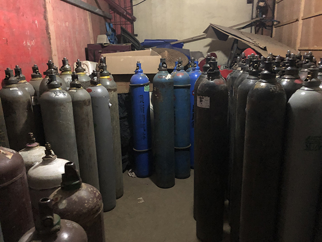 浙江杭州市案例:2021年3月8日上午,浙江省杭州市蕭山區(qū)應急管理局執(zhí)法人員對某公司進行執(zhí)法檢查。期間,執(zhí)法人員發(fā)現(xiàn)廠區(qū)內一簡易鋼棚搭設的倉庫,玻璃窗均被物體人為遮擋,檢查發(fā)現(xiàn)倉庫內堆放了大量?;罚M瓶二氧化碳、氧氣、乙炔、混合氣體、氮氣等176個氣瓶。同時,該倉庫緊鄰公司員工宿舍樓搭設,宿舍樓里還住著數(shù)十個工人,一旦發(fā)生爆炸,后果不堪設想。