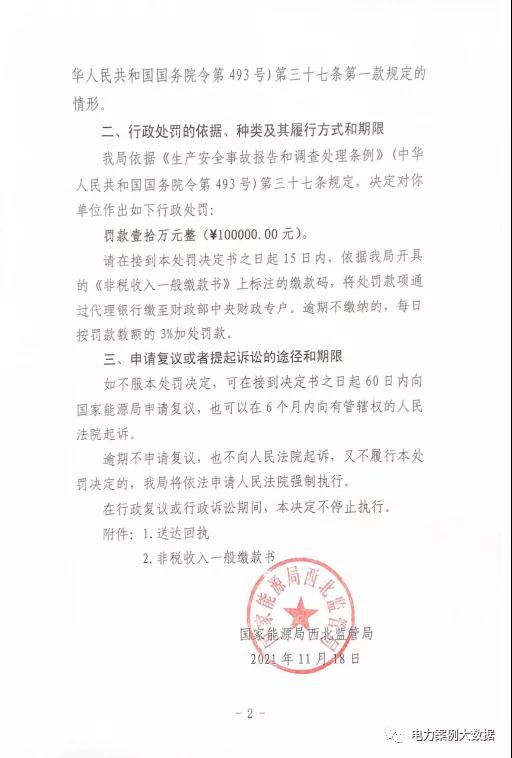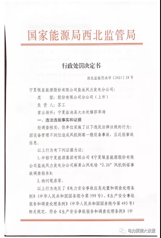 近日,國家能源局西北監(jiān)管局發(fā)布【2021】28號(hào)行政處罰決定書,因設(shè)備管理不到位造成風(fēng)機(jī)倒塔一般設(shè)備事故,且遲報(bào)事故信息,對(duì)寧夏銀星能源股份有限公司鹽池風(fēng)力發(fā)電分公司罰款10萬元。