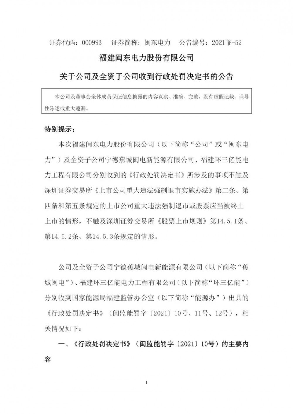 近日,福建閩東電力股份有限公司(以下簡(jiǎn)稱“閩東電力”)向社會(huì)公眾披露了《關(guān)于公司及全資子公司收到行政處罰決定書(shū)的公告》,閩東電力及旗下全資子公司寧德蕉城閩電新能源有限責(zé)任公司(以下簡(jiǎn)稱“蕉城閩電”)、福建環(huán)三億能電力工程有限公司(以下簡(jiǎn)稱“環(huán)三億能”)分別收到國(guó)家能源局福建監(jiān)管辦公室簽發(fā)的《行政處罰決定書(shū)》。