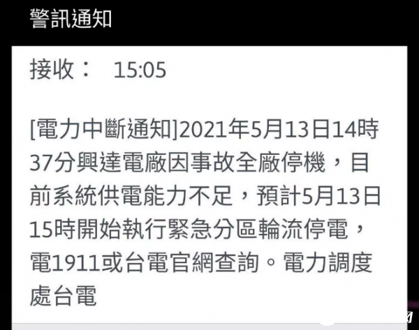 據(jù)報(bào)道,高雄市今天下午近3時(shí),多個(gè)行政區(qū)出現(xiàn)大停電現(xiàn)象,網(wǎng)友抱怨今天天氣30多度,冷氣停電熱到爆。稍早媒體收到“警訊通知”短信,上面寫著“5月13日14時(shí)37分興達(dá)電廠因事故全廠停機(jī),目前系統(tǒng)供電能力不足,預(yù)計(jì)5月13日15時(shí)開始執(zhí)行緊急分區(qū)輪流停電”。臺(tái)電高雄區(qū)處則說(shuō),目前正在了解厘清。