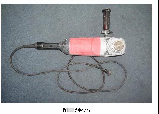 涉事設(shè)備產(chǎn)品名稱為角向磨光機(jī),所有人:彭小共,型號:S1M-HL02B-180,電源電壓:220V-50Hz,額定空載轉(zhuǎn)速:8400r/min,功率:2600W,砂輪外徑:φ180mm,生產(chǎn)單位:蘇州聚匠人五金工具有限公司,銘牌處還有閱讀說明書提示標(biāo)識和佩戴護(hù)目鏡提示標(biāo)識,測得涉事設(shè)備的砂輪片安裝軸直徑為φ25.4mm。涉事設(shè)備的前端部位為金屬材質(zhì),其余部位均為塑料材質(zhì)。