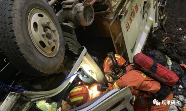 首批消防救援人員趕到現(xiàn)場了解得知,垃圾庫長 48 米、寬 20 米,總深度為 23 米,車輛從卸料平臺跌落至 12 米處的垃圾斜坡地段,呈車頂朝下、車底盤朝上倒翻狀態(tài),而且處于在垃圾坡度為 40 度左右的大斜坡上,隨時有更一步往下翻車至浸水區(qū)的危險?,F(xiàn)場指揮員通過前期勘查,咨詢現(xiàn)場工作人員垃圾廢料區(qū)有無致命氣體危險等相關(guān)情況后,迅速命令 4 名救援人員佩戴空氣呼吸器,攜帶破拆工具、有毒氣體探測儀、多功能救援擔架等救援設(shè)備利用軟梯、繩索下到事故救援點。由于車輛嚴重變形,導致救援操作困難被困者一時無法移出。