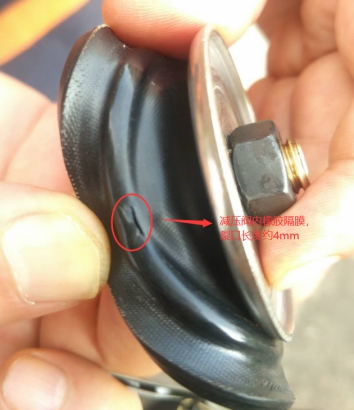 5、8月14日,事故調(diào)查組專家組到淮南市安全閥校驗(yàn)站利用壓縮空氣對(duì)事故中的液化氣氣化爐進(jìn)行氣密性實(shí)驗(yàn)。該氣化爐外觀完整,無明顯損傷,所有外漏的接口處均做了密封處理。經(jīng)通氣實(shí)驗(yàn)發(fā)現(xiàn)氣化爐出氣口的紅色減壓閥頸部漏氣。對(duì)減壓閥進(jìn)行拆解后發(fā)現(xiàn)橡膠隔膜有一長(zhǎng)度約4mm的裂口。