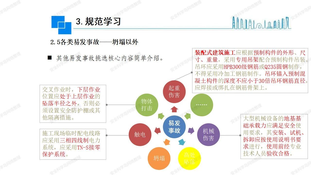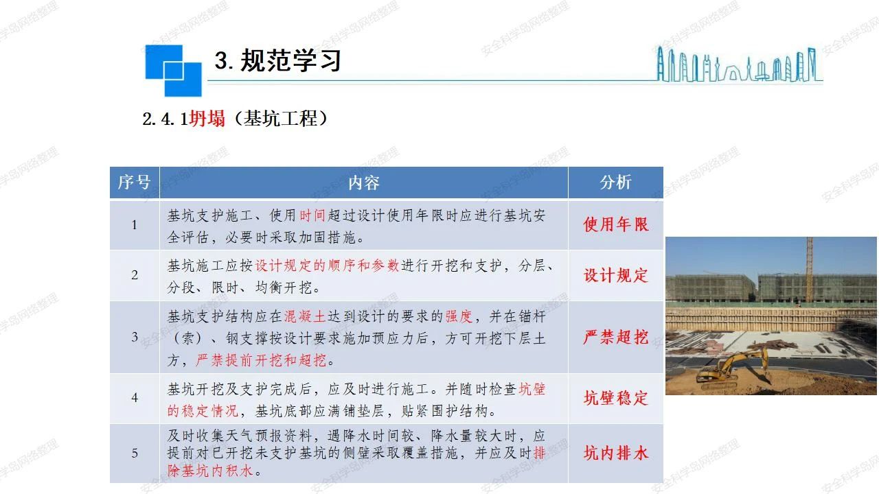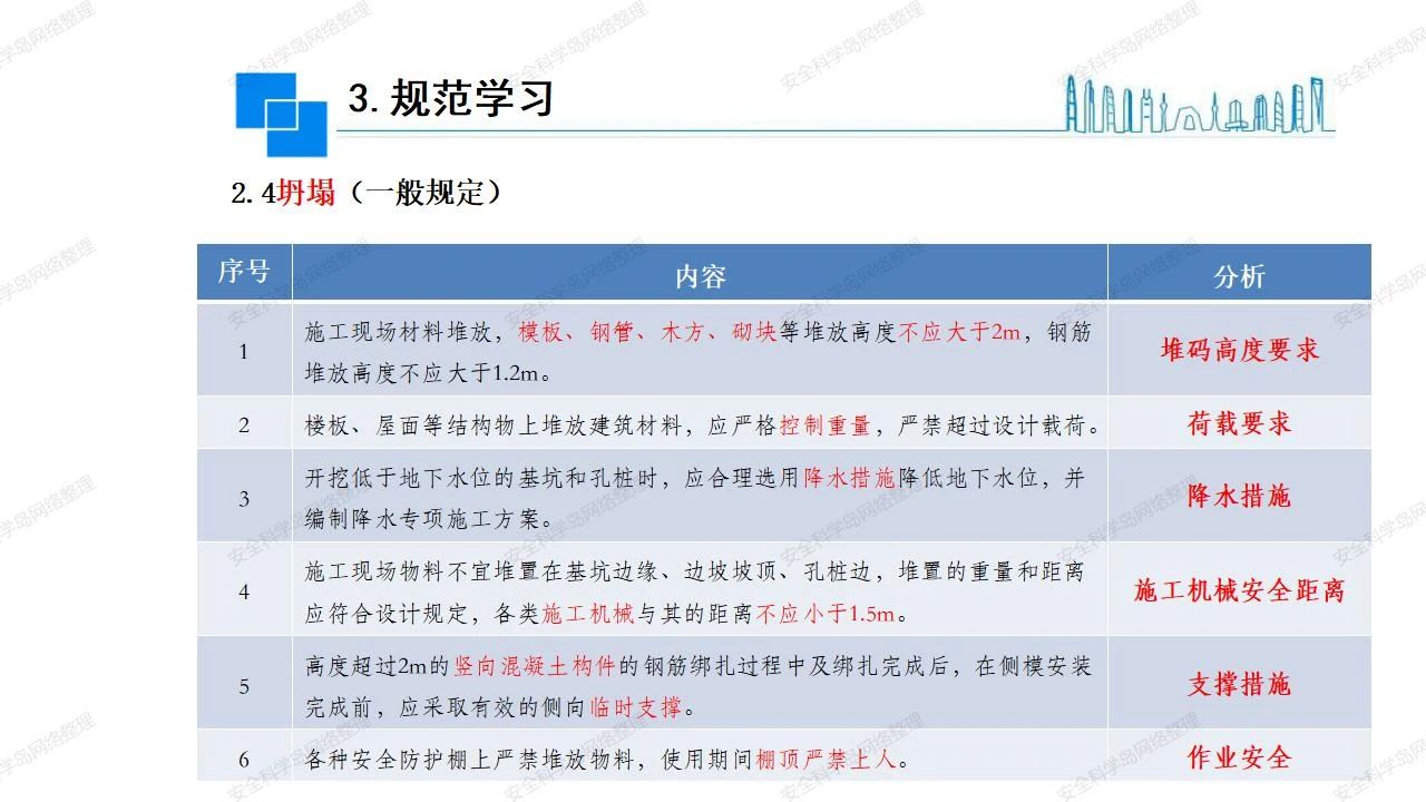 那么,坍塌事故發(fā)生的原因何在? (1)工程結(jié)構(gòu)設(shè)計(jì)不合理或計(jì)算失誤。 (2)施工前沒(méi)有編制切實(shí)可行的施工組織設(shè)計(jì)和專(zhuān)項(xiàng)施工方案,未做具體技術(shù)安全措施交底,特定施工項(xiàng)目未經(jīng)專(zhuān)家評(píng)審論證。 (3)腳手架、模板支撐、起重設(shè)備結(jié)構(gòu)設(shè)計(jì)不合理或計(jì)算失誤。 (4)建筑物結(jié)構(gòu)質(zhì)量低劣,安全性能差,地基不穩(wěn)定,不均勻沉降。 (5)建筑物結(jié)構(gòu)支撐連接(焊接)不牢固,超載、外力沖擊或嚴(yán)重偏心載荷造成失穩(wěn)等。 (6)腳手架及高大模板支架架體結(jié)構(gòu)不符合設(shè)計(jì)與規(guī)范要求,整體安全穩(wěn)定性差、超載或嚴(yán)重偏心荷載,遇外力沖擊或振動(dòng),不按程序拆除架體等因素造成失穩(wěn)等。 (7)基坑、土石方挖土?xí)r土壁不按規(guī)定留設(shè)邊坡(甚至負(fù)坡度),缺乏支護(hù)或支護(hù)不良,土質(zhì)不良或出現(xiàn)地下水、地表水的滲透,土壁經(jīng)不起重載側(cè)壓力或遇外力振動(dòng)、沖擊等因素造成土壁失穩(wěn)滑坡坍塌。 (8)起重設(shè)備技術(shù)安全性能差,結(jié)構(gòu)強(qiáng)度不夠,安全防護(hù)裝置不完善,垂直起重機(jī)與建筑物拉結(jié)差,出現(xiàn)超載、碰撞、升降過(guò)度或違章操作等原因,造成起重設(shè)備倒塌。 (9)現(xiàn)場(chǎng)作業(yè)環(huán)境不良,安全防護(hù)設(shè)施缺乏。 (10)施工現(xiàn)場(chǎng)管理松弛,各項(xiàng)質(zhì)量、安全管理制度流于形式。 (11)片面追求經(jīng)濟(jì)利益,偷工減料,施工質(zhì)量差。 (12)施工隊(duì)伍素質(zhì)差,不執(zhí)行法規(guī)、標(biāo)準(zhǔn),違章指揮、違章作業(yè),思想上存在盲目性、冒險(xiǎn)性、隨意性。 如何預(yù)防坍塌事故? (1)根據(jù)設(shè)計(jì)與規(guī)范要求,認(rèn)真編制施工組織設(shè)計(jì)和專(zhuān)項(xiàng)施工技術(shù)方案、應(yīng)急預(yù)案,做好特定施工項(xiàng)目專(zhuān)家評(píng)審論證及技術(shù)安全交底工作。 (2)支架、腳手架等搭設(shè)完成后應(yīng)組織相關(guān)部門(mén)驗(yàn)收。支架還應(yīng)按方案要求進(jìn)行堆載預(yù)壓。 (3)嚴(yán)格控制模板支架、腳手架等承受的荷載,模板、腳手架及其支撐體系的施工荷載應(yīng)做到均勻分布,并不得超過(guò)設(shè)計(jì)要求。嚴(yán)禁超載、對(duì)構(gòu)筑物進(jìn)行外力沖擊或偏心載荷。 (4)基坑、土石方挖土?xí)r土壁按規(guī)定留設(shè)邊坡,嚴(yán)格按照設(shè)計(jì)坡度進(jìn)行放坡開(kāi)挖,進(jìn)行有效支護(hù)和排水,并設(shè)置專(zhuān)人對(duì)邊坡穩(wěn)定性進(jìn)行檢測(cè)。基坑應(yīng)基坑頂邊緣1m范圍內(nèi)禁止堆放材料。 (5)加強(qiáng)起重設(shè)備的采購(gòu)管理,嚴(yán)禁使用不合格的起重設(shè)備,并定期進(jìn)行檢測(cè),確保各項(xiàng)性能和安全防護(hù)裝置良好;加強(qiáng)起重設(shè)備的安裝、拆除管理;加強(qiáng)起重設(shè)備的使用管理,嚴(yán)禁超載、碰撞或違章操作;加強(qiáng)對(duì)起重設(shè)備操作人員、指揮人員、安拆人員的安全教育培訓(xùn),考核合格后持證上崗。 (6)加強(qiáng)施工現(xiàn)場(chǎng)管理,設(shè)置有效安全防護(hù)設(shè)施。 (7)加強(qiáng)對(duì)從業(yè)人員的培訓(xùn)教育,提高隊(duì)伍素質(zhì),強(qiáng)化質(zhì)量、安全意識(shí)。 (8)強(qiáng)化工程質(zhì)量報(bào)驗(yàn)和檢驗(yàn)、簽證制度,不經(jīng)檢驗(yàn)合格,不準(zhǔn)進(jìn)行下道工序施工。 (9)發(fā)現(xiàn)坍塌事故的險(xiǎn)情,要認(rèn)真分析原因,積極研究提出排除隱患的整改措施,并監(jiān)督執(zhí)行。