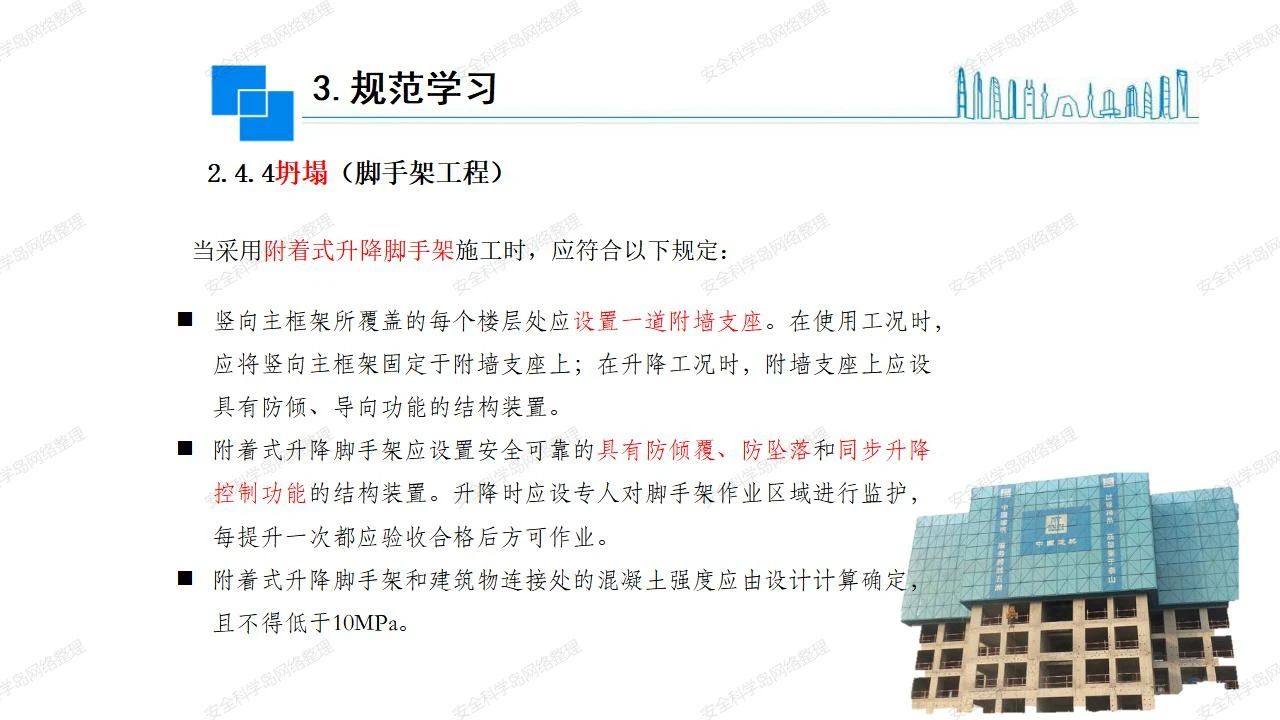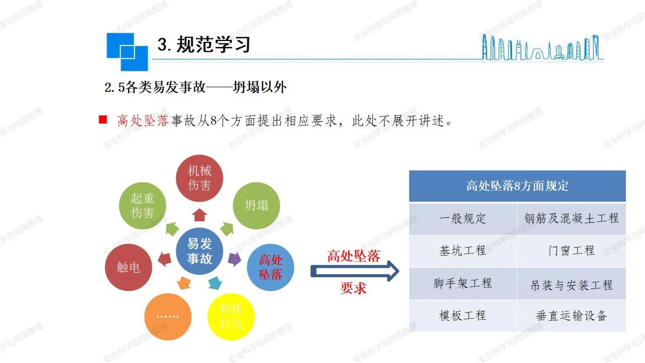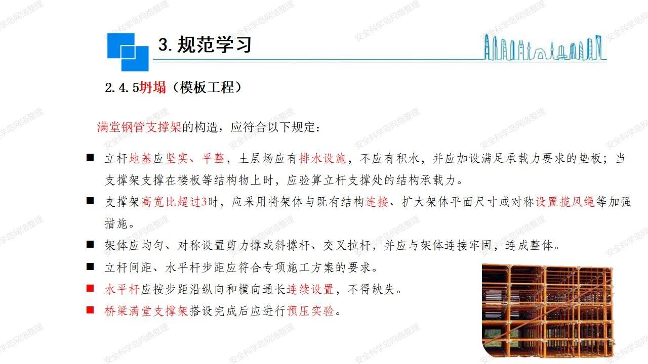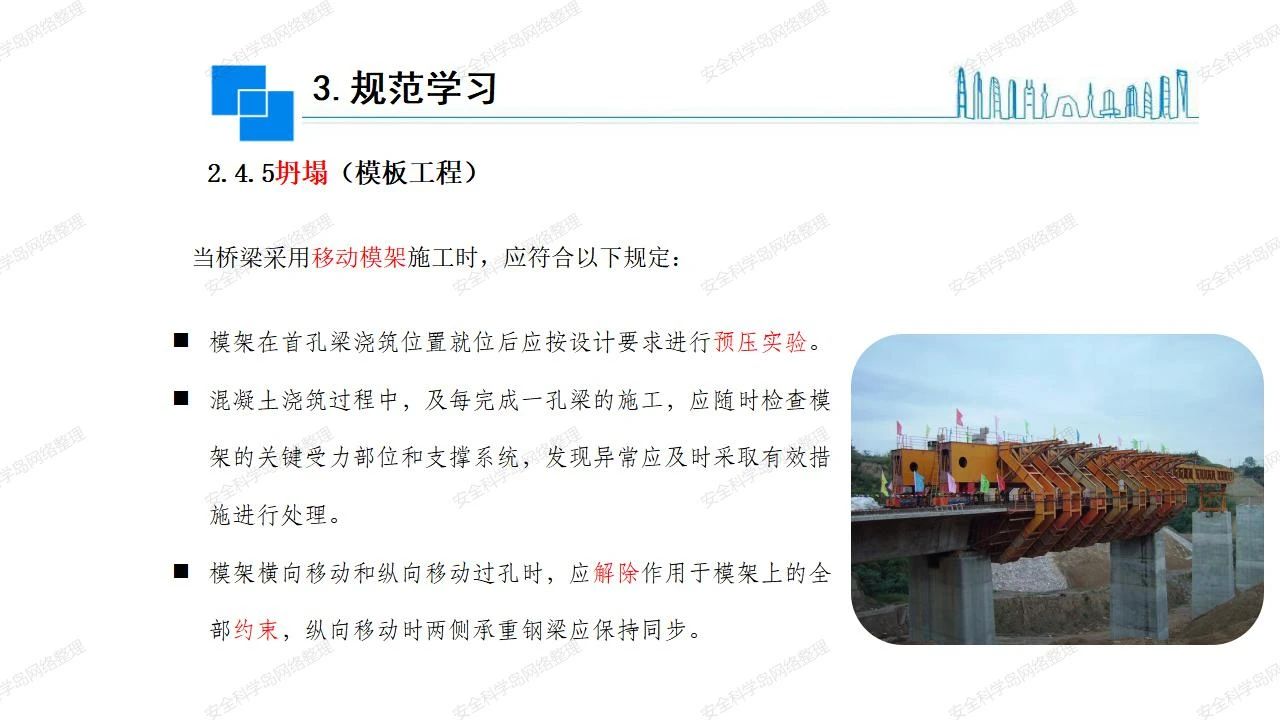 那么,坍塌事故發(fā)生的原因何在? (1)工程結(jié)構(gòu)設(shè)計(jì)不合理或計(jì)算失誤。 (2)施工前沒(méi)有編制切實(shí)可行的施工組織設(shè)計(jì)和專(zhuān)項(xiàng)施工方案,未做具體技術(shù)安全措施交底,特定施工項(xiàng)目未經(jīng)專(zhuān)家評(píng)審論證。 (3)腳手架、模板支撐、起重設(shè)備結(jié)構(gòu)設(shè)計(jì)不合理或計(jì)算失誤。 (4)建筑物結(jié)構(gòu)質(zhì)量低劣,安全性能差,地基不穩(wěn)定,不均勻沉降。 (5)建筑物結(jié)構(gòu)支撐連接(焊接)不牢固,超載、外力沖擊或嚴(yán)重偏心載荷造成失穩(wěn)等。 (6)腳手架及高大模板支架架體結(jié)構(gòu)不符合設(shè)計(jì)與規(guī)范要求,整體安全穩(wěn)定性差、超載或嚴(yán)重偏心荷載,遇外力沖擊或振動(dòng),不按程序拆除架體等因素造成失穩(wěn)等。 (7)基坑、土石方挖土?xí)r土壁不按規(guī)定留設(shè)邊坡(甚至負(fù)坡度),缺乏支護(hù)或支護(hù)不良,土質(zhì)不良或出現(xiàn)地下水、地表水的滲透,土壁經(jīng)不起重載側(cè)壓力或遇外力振動(dòng)、沖擊等因素造成土壁失穩(wěn)滑坡坍塌。 (8)起重設(shè)備技術(shù)安全性能差,結(jié)構(gòu)強(qiáng)度不夠,安全防護(hù)裝置不完善,垂直起重機(jī)與建筑物拉結(jié)差,出現(xiàn)超載、碰撞、升降過(guò)度或違章操作等原因,造成起重設(shè)備倒塌。 (9)現(xiàn)場(chǎng)作業(yè)環(huán)境不良,安全防護(hù)設(shè)施缺乏。 (10)施工現(xiàn)場(chǎng)管理松弛,各項(xiàng)質(zhì)量、安全管理制度流于形式。 (11)片面追求經(jīng)濟(jì)利益,偷工減料,施工質(zhì)量差。 (12)施工隊(duì)伍素質(zhì)差,不執(zhí)行法規(guī)、標(biāo)準(zhǔn),違章指揮、違章作業(yè),思想上存在盲目性、冒險(xiǎn)性、隨意性。 如何預(yù)防坍塌事故? (1)根據(jù)設(shè)計(jì)與規(guī)范要求,認(rèn)真編制施工組織設(shè)計(jì)和專(zhuān)項(xiàng)施工技術(shù)方案、應(yīng)急預(yù)案,做好特定施工項(xiàng)目專(zhuān)家評(píng)審論證及技術(shù)安全交底工作。 (2)支架、腳手架等搭設(shè)完成后應(yīng)組織相關(guān)部門(mén)驗(yàn)收。支架還應(yīng)按方案要求進(jìn)行堆載預(yù)壓。 (3)嚴(yán)格控制模板支架、腳手架等承受的荷載,模板、腳手架及其支撐體系的施工荷載應(yīng)做到均勻分布,并不得超過(guò)設(shè)計(jì)要求。嚴(yán)禁超載、對(duì)構(gòu)筑物進(jìn)行外力沖擊或偏心載荷。 (4)基坑、土石方挖土?xí)r土壁按規(guī)定留設(shè)邊坡,嚴(yán)格按照設(shè)計(jì)坡度進(jìn)行放坡開(kāi)挖,進(jìn)行有效支護(hù)和排水,并設(shè)置專(zhuān)人對(duì)邊坡穩(wěn)定性進(jìn)行檢測(cè)。基坑應(yīng)基坑頂邊緣1m范圍內(nèi)禁止堆放材料。 (5)加強(qiáng)起重設(shè)備的采購(gòu)管理,嚴(yán)禁使用不合格的起重設(shè)備,并定期進(jìn)行檢測(cè),確保各項(xiàng)性能和安全防護(hù)裝置良好;加強(qiáng)起重設(shè)備的安裝、拆除管理;加強(qiáng)起重設(shè)備的使用管理,嚴(yán)禁超載、碰撞或違章操作;加強(qiáng)對(duì)起重設(shè)備操作人員、指揮人員、安拆人員的安全教育培訓(xùn),考核合格后持證上崗。 (6)加強(qiáng)施工現(xiàn)場(chǎng)管理,設(shè)置有效安全防護(hù)設(shè)施。 (7)加強(qiáng)對(duì)從業(yè)人員的培訓(xùn)教育,提高隊(duì)伍素質(zhì),強(qiáng)化質(zhì)量、安全意識(shí)。 (8)強(qiáng)化工程質(zhì)量報(bào)驗(yàn)和檢驗(yàn)、簽證制度,不經(jīng)檢驗(yàn)合格,不準(zhǔn)進(jìn)行下道工序施工。 (9)發(fā)現(xiàn)坍塌事故的險(xiǎn)情,要認(rèn)真分析原因,積極研究提出排除隱患的整改措施,并監(jiān)督執(zhí)行。