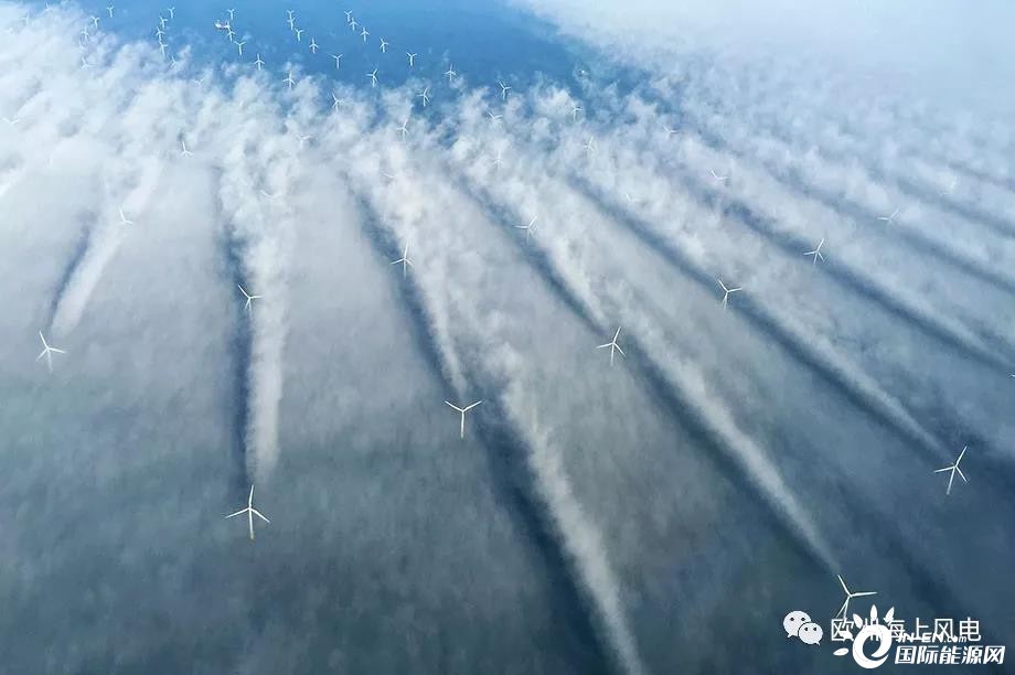Horns Rev 1是全球第一座商業(yè)化規(guī)模的海上風(fēng)場,最早由沃旭開發(fā),安裝了80臺2MW Vestas風(fēng)機(jī),葉輪直徑80米,輪轂高度80米,總裝機(jī)160MW。場址所在位置風(fēng)功率密度398W / m2,最遠(yuǎn)離岸距離18公里,最大水深14米。下圖這張顯示風(fēng)機(jī)尾流影響的著名照片就來自于這座風(fēng)場。