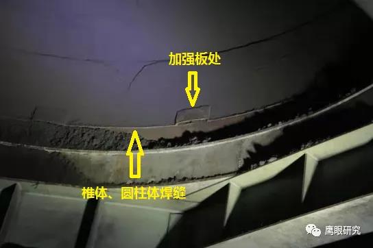 (設(shè)計(jì)較單薄,僅靠兩道搭接角焊縫(還只能單面焊)將錐斗與柱倉連接,煤斗在設(shè)計(jì)上確實(shí)存在隱患,不能光靠焊縫來受力,底部夾角處應(yīng)增加一圈三角板,即使不能滿焊也能增加一定強(qiáng)度。)