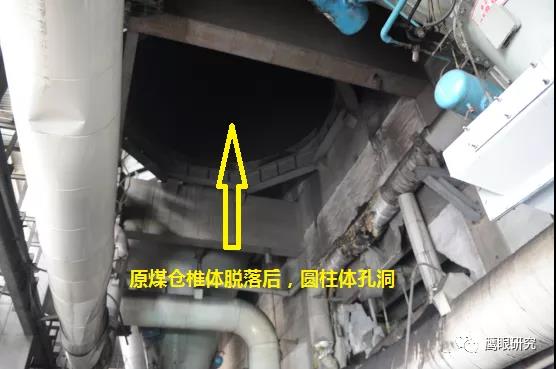 現(xiàn)場檢查,#2爐2D原煤倉下部錐體部脫落,砸壞2D給煤機(jī)平臺(tái),連同給煤機(jī)墜落至#2鍋爐零米,2D給煤機(jī)損壞、2C、2D磨煤機(jī)油站、2D磨煤機(jī)、給煤機(jī)附近區(qū)域電纜、輔汽聯(lián)箱管道等設(shè)備不同程度受損,無人員傷害及主設(shè)備損壞。(堵煤次數(shù)太多,敲塌了?)