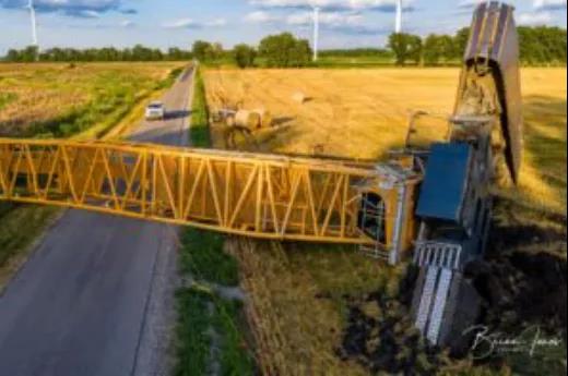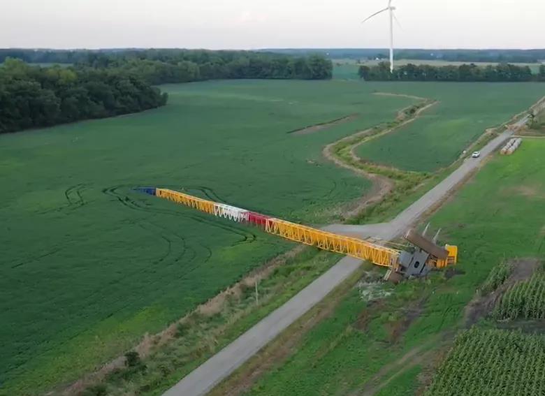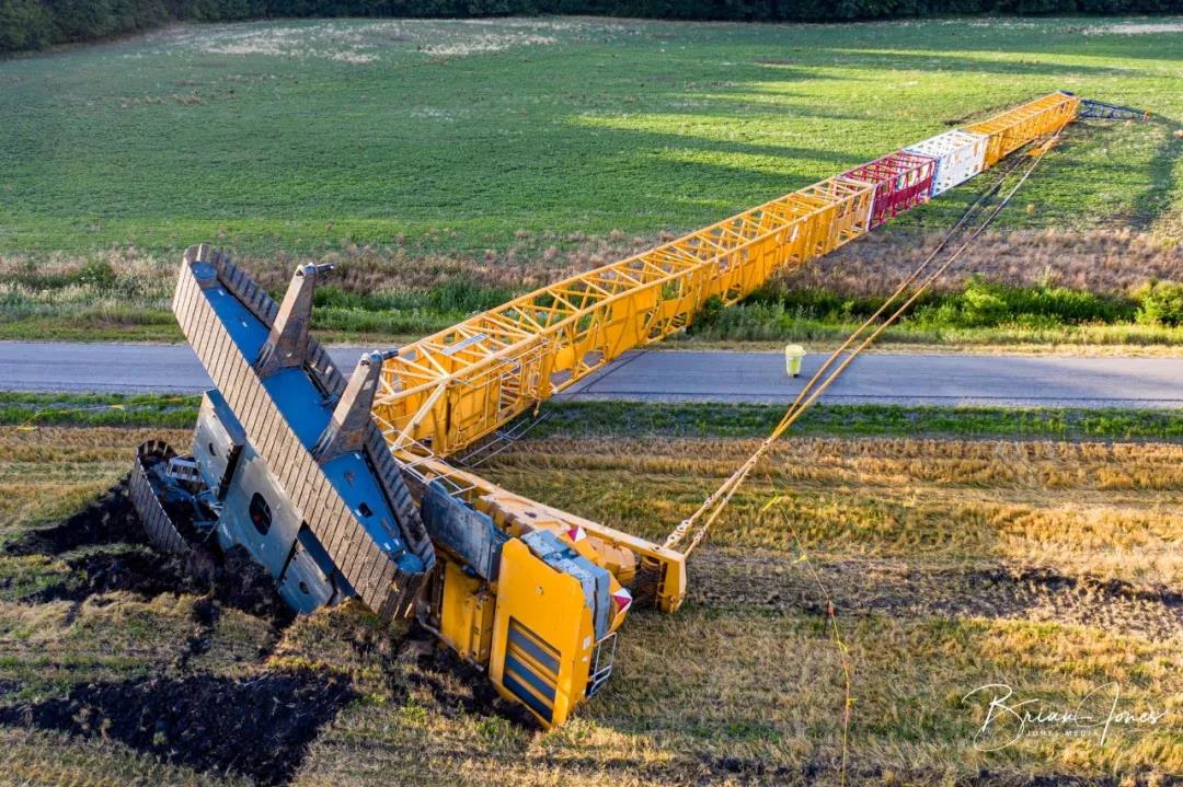 該風(fēng)電場項目準(zhǔn)備安裝 61 臺渦輪機,最大發(fā)電量為 219.6 兆瓦。該項目將覆蓋約 50,000 英畝土地。事故吊車屬于當(dāng)?shù)匾患绎L(fēng)能和太陽能公司,當(dāng)時這輛800t履帶吊車正用于安裝風(fēng)電機組,該風(fēng)電機組通常位于雅芳北部和特里普西南部。當(dāng)時疑似下方地面松軟,未進行吊裝前的勘察工作,負(fù)載過高造成大規(guī)模下陷,從而導(dǎo)致整車側(cè)翻。