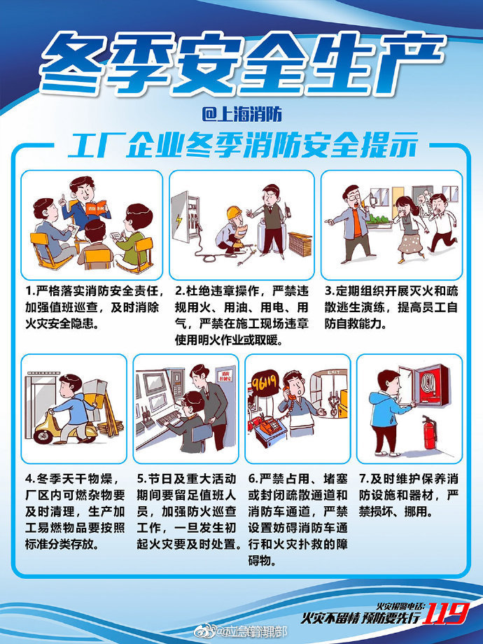 進(jìn)入冬季,工廠(chǎng)企業(yè)安全生產(chǎn)至關(guān)重要,各個(gè)生產(chǎn)單位切記做好檢查工作,防患于未然。加強(qiáng)值班巡查、嚴(yán)禁在施工現(xiàn)場(chǎng)違章使用明火作業(yè)或取暖、定期組織開(kāi)展滅火和疏散逃生演練……工廠(chǎng)企業(yè)冬季消防安全,這幾點(diǎn)要注意!